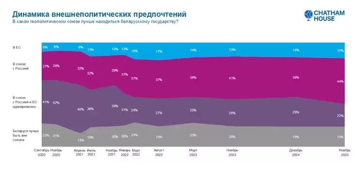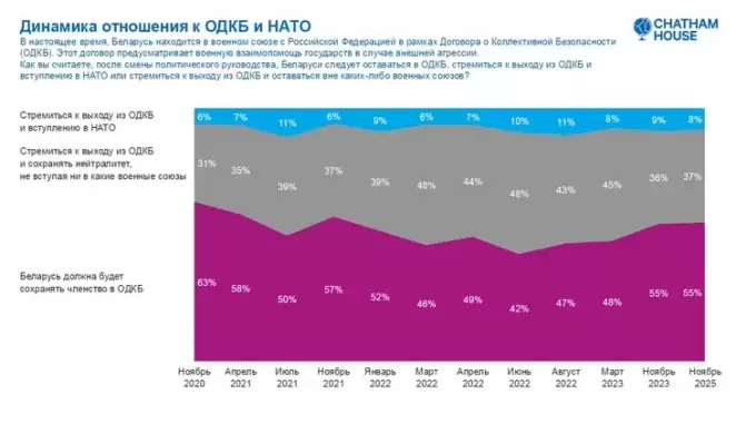 Chatham House представил результаты нового исследования взглядов беларусов на войну, внутреннюю и внешнюю политику, пишет НН.
