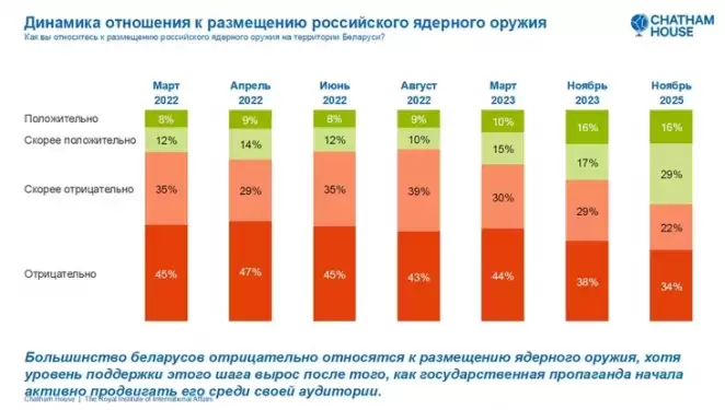 Результаты опроса продемонстрировали слабую осведомленность белорусов о деталях военного сотрудничества с Россией. Так, только около трети опрошенных заявили, что знают о планах размещения комплекса «Орешник» и тактического ядерного оружия (соответственно 32% и 33%).