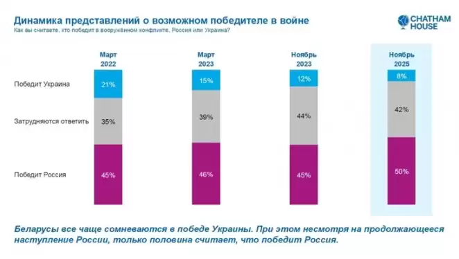 При этом за последний год белорусы стали меньше верить в победу Украины — таких только 8% (год назад было 12%). О том, что победит Россия, высказался каждый второй опрошенный. Но и большой процент тех, кому было трудно ответить — 42%.