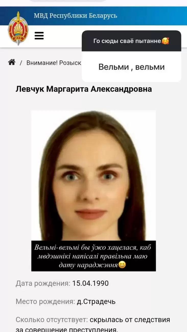 О том, что фото Маргариты Левчук теперь можно увидеть на стендах «Их разыскивает милиция» в Беларуси, сообщила сама певица на своей странице в инстаграме.