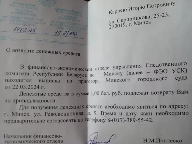 «Следственный комитет приглашает в свое минское управление, чтобы я мог забрать по ведомости… 1 рубль. Нет, никакая не описка: не 1000, не 100 и даже не 10. А именно 1», — написал Игорь Карней в своем фейсбуке.