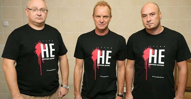 Правозащитник Олег Гулак, певец Стинг и правозащитник Валентин Стефанович в майках инициативы «Нет смертной казни в Беларуси». Фото: Владимир Цеслер / Facebook