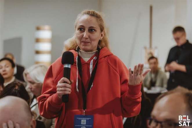Бывшая политзаключенная Ольга Филатченкова задает вопрос во время II Конгресса по политзаключенным в Беларуси. Познань, Польша. 28 сентября 2025 года. Фото: Рауль Дюк / Белсат