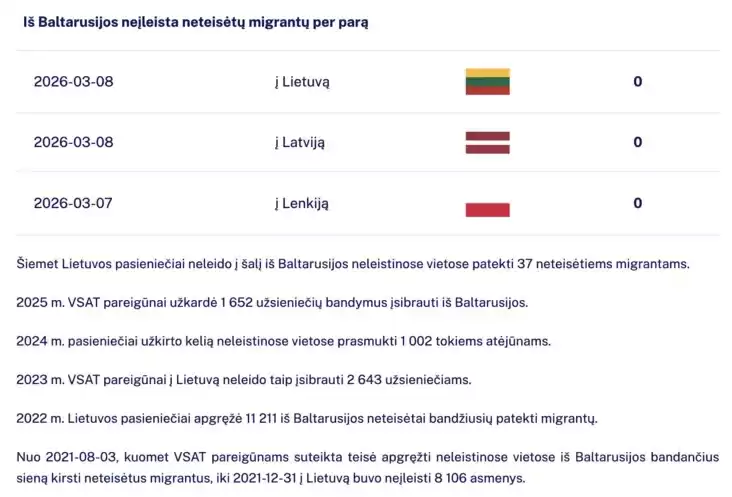 Об изменившейся ситуации с нелегальной миграцией со стороны Беларуси, говорили и в Службе охраны государственной границы Литовской Республики. В комментарии литовскому изданию представитель Службы одной из причин, почему так происходит, назвал отсутствие с белорусской стороны активных действий по организации перевозки мигрантов и их переселению.