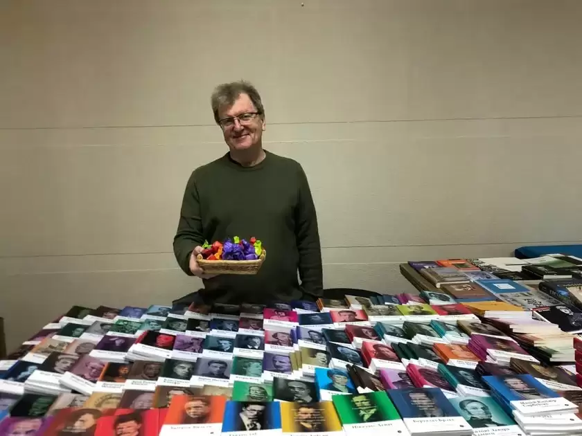 Змитер Колос с книгами, которые он издал. На минской книжной выставке 2023 года. Фото: фейсбук