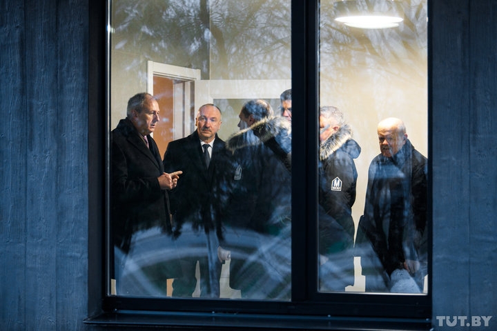 На площадке гости побывали в гродненском коттедже-«каркаснике», с интересом рассмотрели стену в разрезе. Представитель Гродно рассказал, что коттеджи этого типа строятся уже семь лет — и нареканий у потребителя не возникает. Леонид Анфимов поинтересовался стоимостью и сроками строительства.