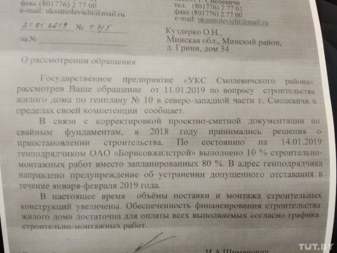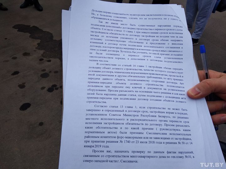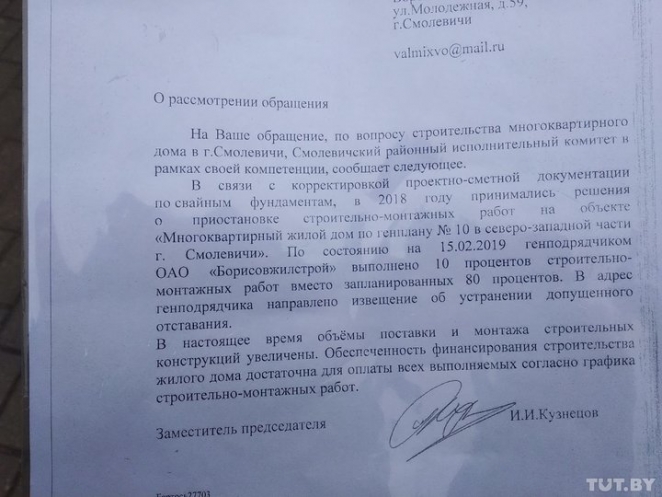В приемной председателя райисполкома изложение сути проблемы заняло не более нескольких минут: люди хотят быть уверены, что строительство дома будет закончено хотя бы в обозначенные в третий раз сроки. Свое коллективное обращение, изложенное на бумаге и подкрепленное подписями, они передали лично в руки чиновнику из АП.