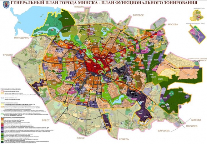 Зампред Белорусского союза архитекторов Михаил Гаухфельд для наглядности показывает два Генплана Минска. Первый — образца 2010 года. В нем указано, что город планирует разрастаться за пределы МКАД. Там запланирована комплексная застройка той же Щомыслицы и других районов за кольцевой.
