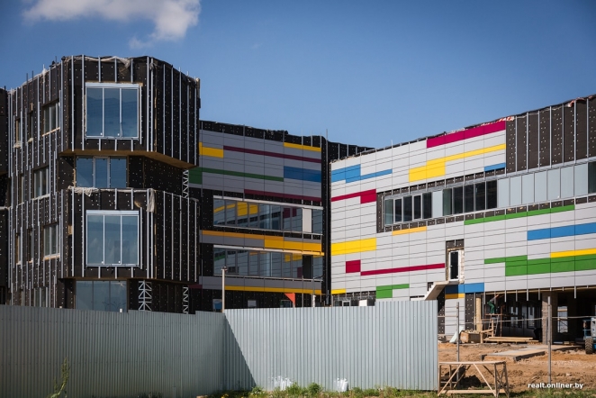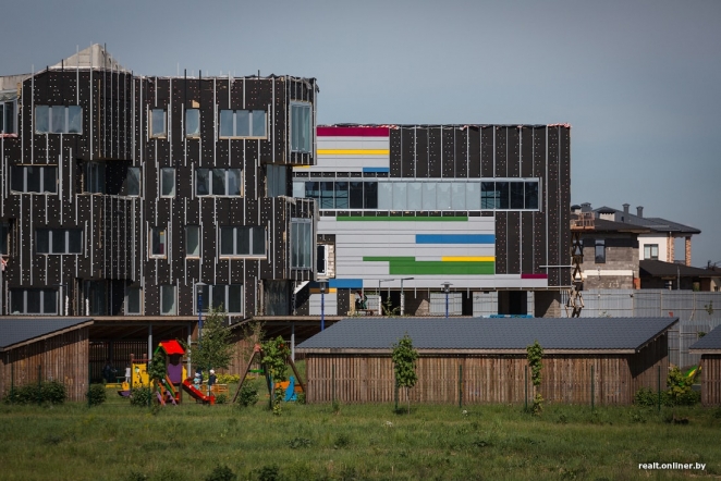 Стройка школы ведется на территории бывшей деревни Веснинка — за последние годы этот «медвежий угол» на краю Минска превратился в один из самых престижных и дорогих районов, где особняки бизнесменов соседствуют с коттеджами чиновников, спортсменов и известных артистов.