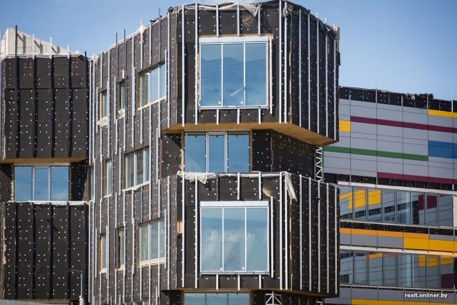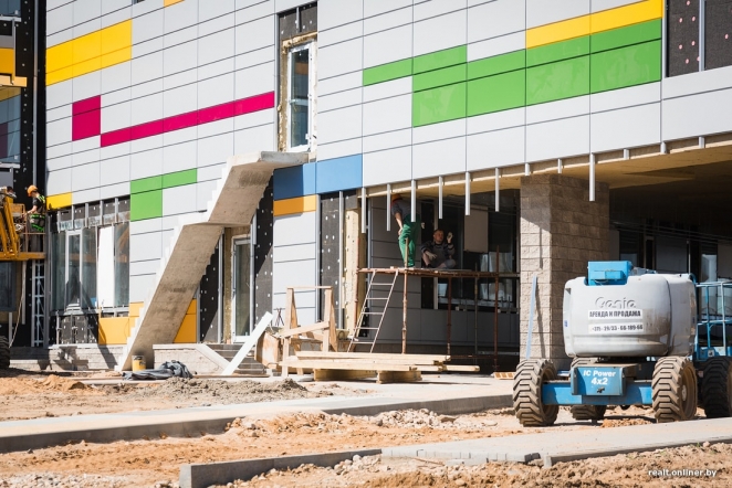Недавно строители приступили к монтажу панелей вентилируемого фасада. Уже можно представить, как школа будет выглядеть в будущем.