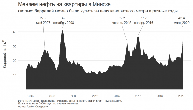 Давайте посмотрим, что выйдет, если среднюю цену квадратного метра пересчитать в баррелях нефти.