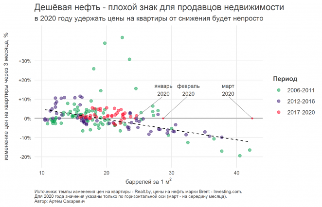 Цены на нефть марки Brent 16 марта опускались ниже отметки в 30 долларов за баррель — такого обвала не было уже 4 года. Нефть дешевеет три месяца подряд, потеряв за это время половину своей стоимости. Цены на квартиры, напротив, с начала 2020 года показывали исключительно рост.