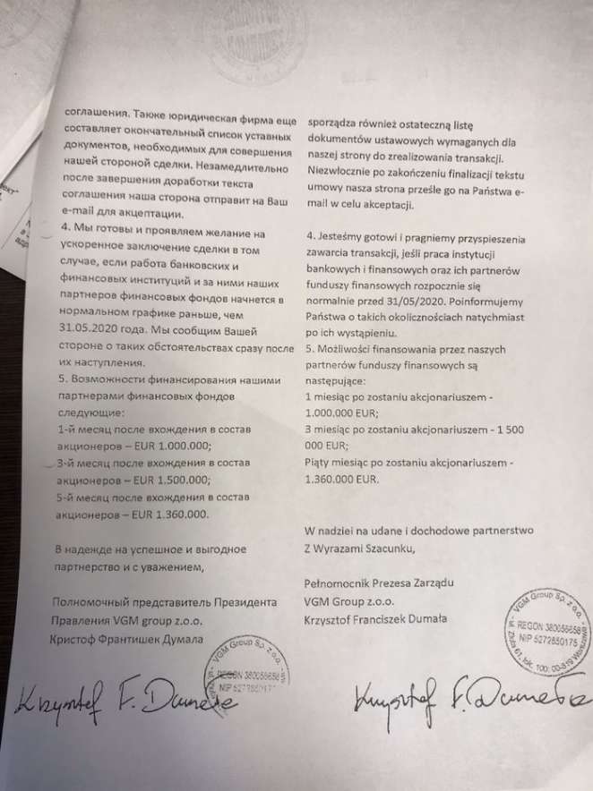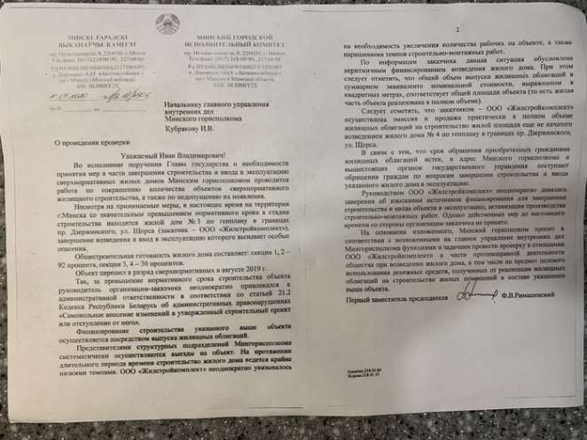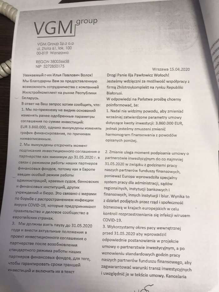 Ранее сообщалось, что помогать достраивать жилой комплекс «Грушевский посад» будет польская компания VGM group. Даже было подтверждающее письмо, которое передали в Мингорисполком (фото документа предоставлены держателями облигаций):