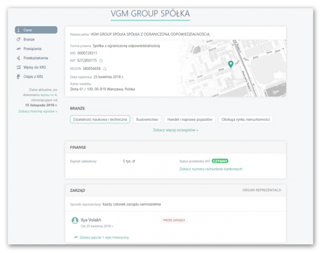 Что известно про VGM group? На сайте rejestr. io (польский аналог нашей Картотеки), сообщается что председателем совета правления VGM group c 2018 года является Ilya Volakh. Тот ли это Илья Волох, которому принадлежит ООО «Жилстройкомплект», или полный тезка — мы не знаем.