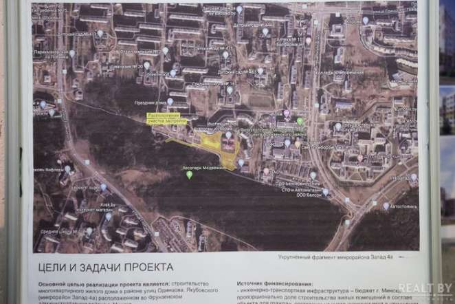 Со слов местных жителей, в 2009 году люди просили президента построить здесь дом или общежитие для сотрудников У П Светоприбор ООО «БелТИЗ» — единственного предприятия в Минске, где работают люди с плохим зрением. Но безрезультатно — в апреле 2016 года президентским указом участок отошел «Заводу эффективных промышленных конструкций». Изначально застройщик хотел возвести здесь 16-этажку, но жители выступили «против», а РУП «Главгосстройэкспертиза» выдало отрицательное заключение государственной экспертизы.