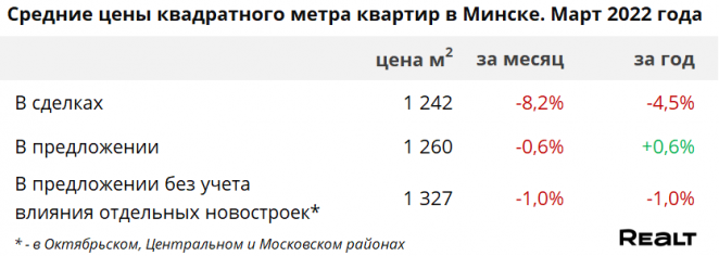 В марте 2022 года количество сделок купли-продажи квартир в Минске упало сразу на 18%, а цена за метр — на 8%, сообщает Realt.by.