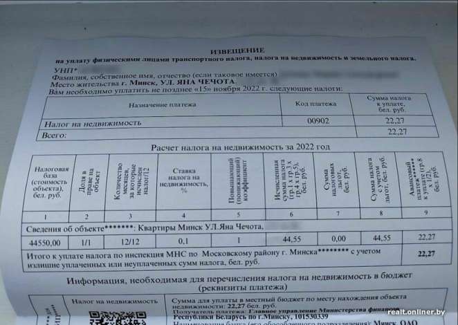 Платежку от налоговой инспекции показал Onlíner один из жителей Московского района Минска. Бумага интересная, ведь это просьба об уплате того самого налога на первую квартиру, который взбудоражил инфополе еще прошлой осенью. Раньше пошлину нужно было платить только со второго и последующего жилья, теперь такие квитанции будут приходить и тем, у кого квартира одна.