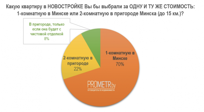 Если говорить о расположении, то люди по-прежнему хотят жить в столице, а к пригороду относятся со скепсисом. Так, на вопрос, какую квартиру в новостройке вы бы выбрали за одну и ту же стоимость — однушку в Минске или двушку в пригороде (до 15 км), 70% респондентов предпочли первый вариант.