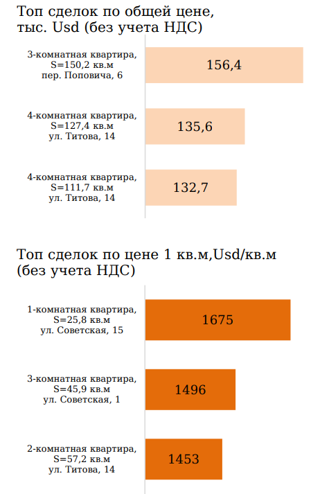 В этом же городе находится самое дорогое жилье: трехкомнатная квартира площадью 150 метров была продана за 156 тыс. долларов. Самым дорогим квадратным метром (1675 долл.) обладала 1-комнатная квартира в 25,8 кв. метров на улице Советской.