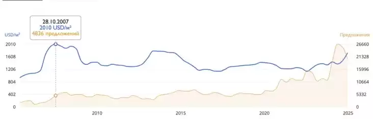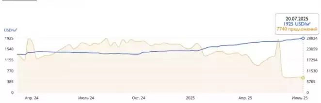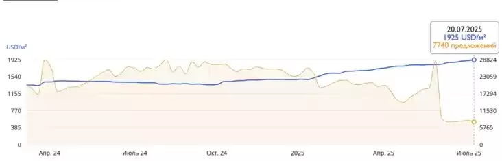 Примечательно, что в последние месяцы рост только ускорился. Если 18 мая стоимость метра по предложениям составляла $1810, то всего через два месяца она достигла $1925. Это плюс 6,3% за два месяца.