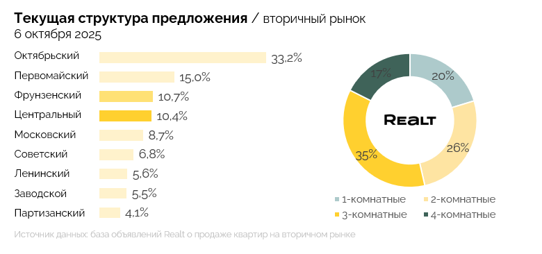 Динамика предложения по всем районам показала разнонаправленные изменения. Существеннее всего это коснулось Октябрьского района — плюс 22,9%, также Советского района — плюс 22,3%.