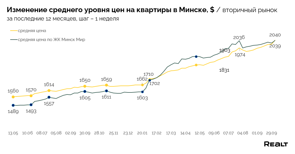 В результате, за последнюю неделю мы видим, что средняя стоимость кв. м. в рамках недели подросла на 1.7% до 2040 $/м2. Цена кв. м. на квартиры в Минск-Мире также поднялась на 1.2% и достигла 2039 $/м