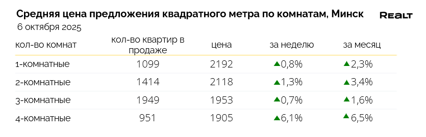 Среди комнат динамика была положительной. Существеннее всего цены поднялись на двухкомнатные квартиры (+1.3%), а также в 4-комнатных квартирах (+6.1%).