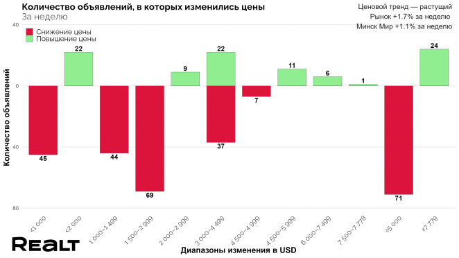 За прошлую неделю подешевело 317 квартиры в среднем на 1000−5000 долларов — это около 7% от всего предложения. В то же время 130 квартир в продаже (около 3%) стали дороже в среднем на 1600−7000 долларов.