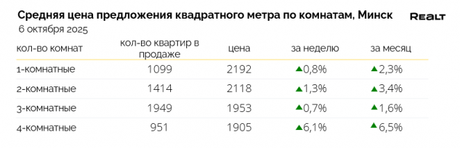 Брест — 1130 $/м2 (без изменений), Витебск — 887 $/м2 (+0.1%), Гомель — 946 $/м2 (без изменений), Гродно — 1034 $/м2 (+0.8%), Могилев — 989 $/м2 (-1.1%).