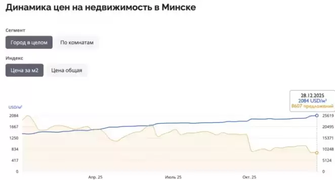 За 2025 год цена предложения квадрата в Минске выросла на 47%, с $1416 до $2084.