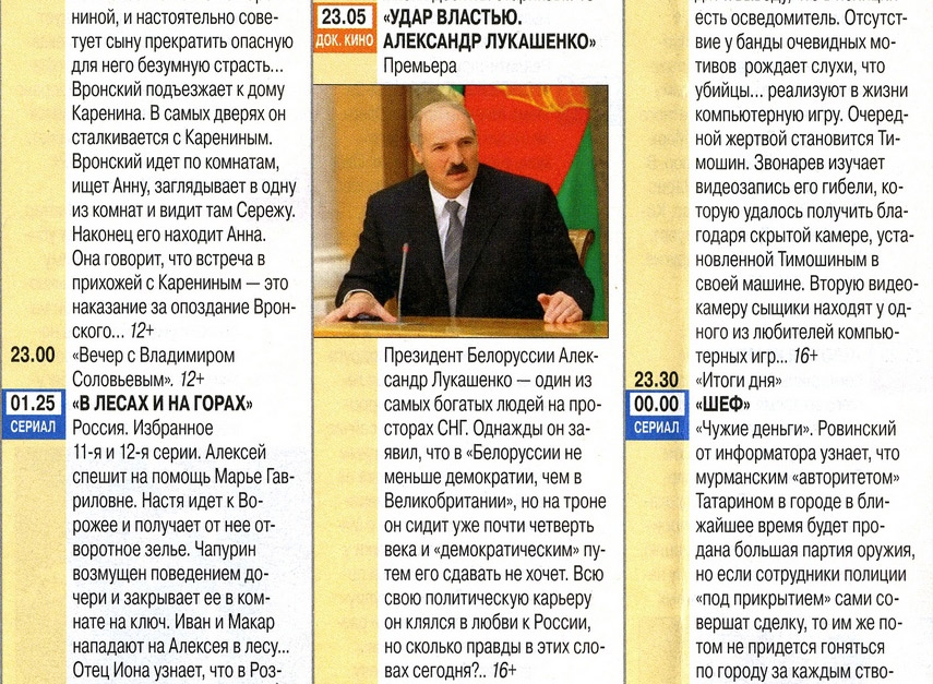 "Удар властью" должны были показать 18 апреля в 23.05. В аннотации передачи Лукашенко называли "одним из самых богатых людей на просторах СНГ", который "сидит на троне уже почти четверть века и демократическим путем его сдавать не хочет".