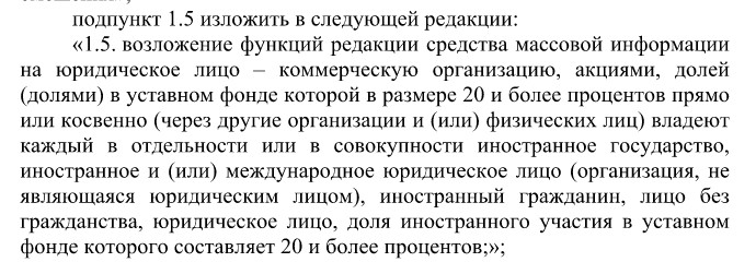 Вот как выглядит сегодняшняя формулировка в законе о СМИ, отказ в регистрации из-за иностранного финансирования (ст. 15 пункт 1.5):