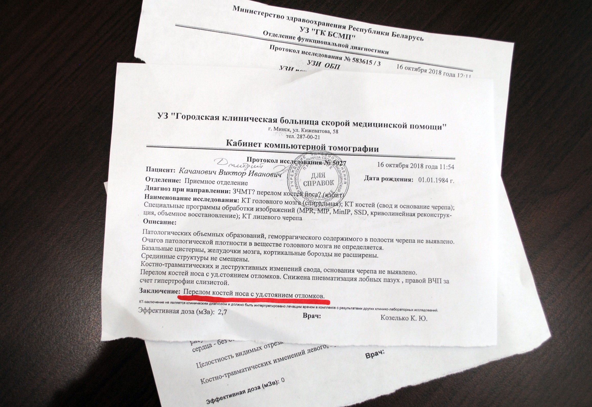 На следующий день утром задержанных увезли в Заводской РУВД. Там конвоир, увидев разбитое лицо Дмитрия, вызвал скорую. Медики зафиксировали у Качановича перелом костей носа, сильные удары ребер и синяки на теле и запястьях. В результате издевательств Дмитрий еще долго не мог свободно владеть руками, лечился и наблюдался у хирурга.