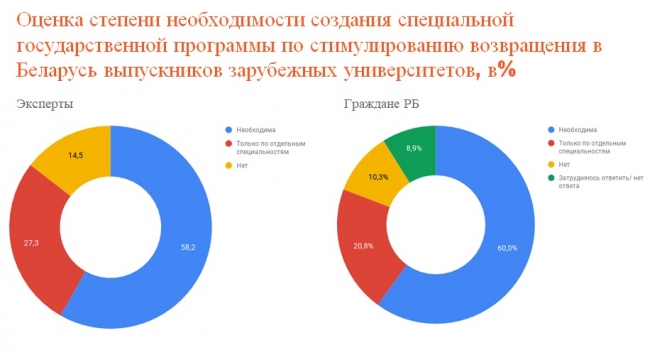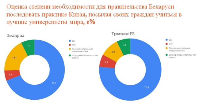 Невостребованные и социально незащищенные специалисты Согласно исследованию большинство экспертов и простых граждан положительно оценивают факт того, что белорусы получают образование за рубежом, но не верят, что после окончания учебы они вернутся назад. Хотя, у некоторых выпускников иностранных вузов такое желание возникает. – Ностальгия, ограничение общения с семьей и друзьями, сложности адаптации к другому менталитету, трудности трудоустройства в государствах ЕС порой вынуждают белорусов вернуться на Родину, – подчеркивает руководитель проекта «Твоё завтра» Инна Кулей. Но, по ее словам, государство не ждет специалистов, окончивших иностранные университеты. Они часто оказываются невостребованными, и менее социально защищенными, чем выпускники отечественных вузов. – По нашим опросам бывших студентов программы Калиновского и других образовательных программ, желающих вернуться в Беларусь с каждым годом все меньше. Однако из вернувшихся только 17% работает по специальности. 25% при устройстве на работу в Беларуси вообще не показывает свой иностранный диплом, – говорит Инна Кулей. Чему стоит поучиться у китайцев? В тоже время, результаты исследования свидетельствуют, что без специалистов, получивших высшее образование за рубежом невозможно успешное реформирование Беларуси. Так считает 60% опрошенных экспертов. – В этом отношении очень интересен опыт Китая. Он уже много лет за государственный счет посылает тысячи своих граждан учиться в лучшие университеты мира, чтобы потом полученные знания использовать на благо своей страны, – отмечает Анатолий Лысюк. Абсолютное большинство опрошенных считает, что этот китайский опыт следует укоренить и в Беларуси.