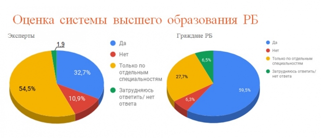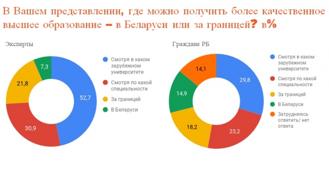 В тоже время абсолютное большинство экспертов и простых граждан уверено, что образование за рубежом лучше. Обратного мнения придерживаются только 7,3% экспертов и 14,9% белорусов.