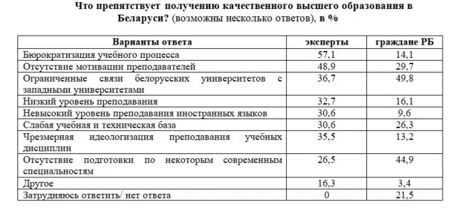 Среди причин, которые препятствуют получению качественного высшего образования в Беларуси, эксперты в первую очередь назвали бюрократизацию учебного процесса и отсутствие мотивации преподавателей. По мнению простых граждан, основными проблемами белорусского образования являются: отсутствие подготовки по некоторым современным специальностям, ограниченные связи белорусских университетов с западными.