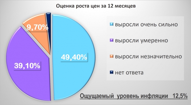 По мнению 2 тысяч участников опроса в среднем цены за последний год выросли на 12,5%. В то время как согласно официальной статистике инфляция за этот период не превысила 6%.