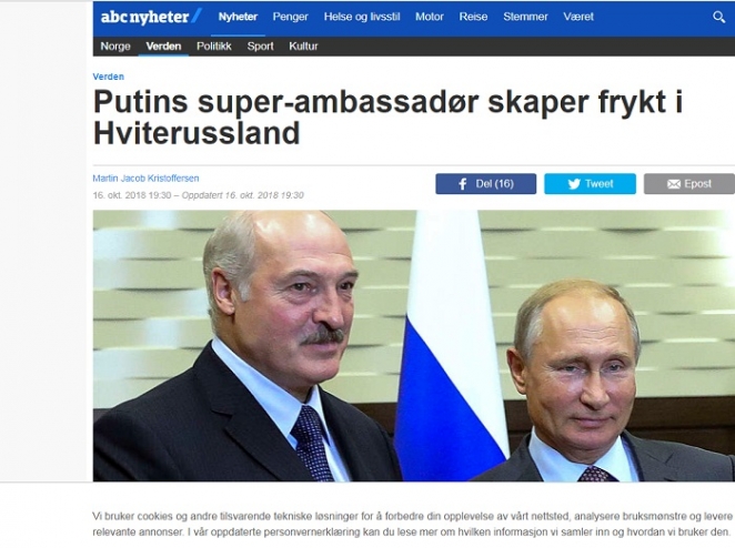 Осенью заголовок материала на abcnyheter.no гласил: «Путинский супер-посол создает страх в Беларуси». Текст посвящен послу России Михаилу Бабичу.
