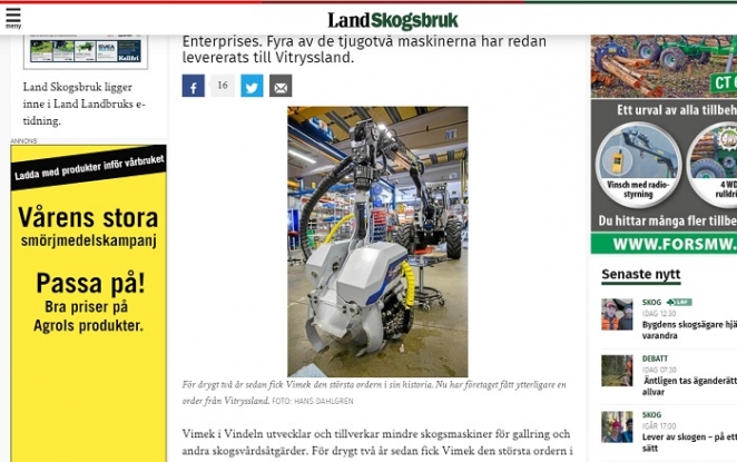 Landskogsbruk.se cообщает, что производитель лесозаготовительной техники Vimek получил заказ на 22 машины для белорусского государственного лесного хозяйства. Шведы вспоминают, что чуть более двух лет назад Vimek получил самый большой заказ в своей истории – 126 лесозаготовительных машин для белорусских государственных лесных предприятий.