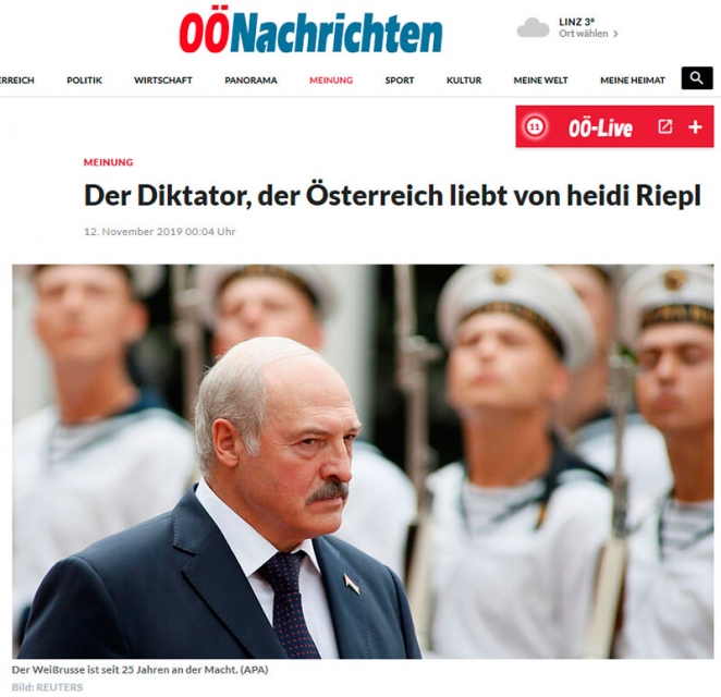 В сегодняшней статье Oberösterreichische Nachrichten под заголовком «Диктатор, который любит Австрию» говорится о том, что Александр Лукашенко «без сомнения будет наслаждаться своим приемом в Австрии в полной мере». А фото с австрийским коллегой для 65-летнего белорусского руководителя станет символической победой.