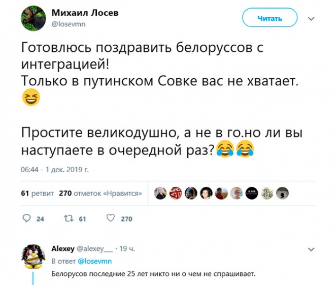 — Во-вторых, если Беларусь не войдет в состав России, или это не будет нечто похожее на СССР, или на худой конец на ЕС, тогда вообще непонятно, зачем все это, — добавляет автор. И резюмирует: