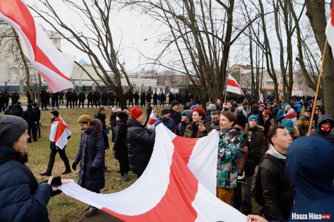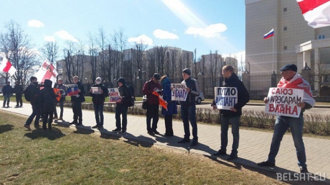 В воскресенье сотни активистов пришли к дипломатическому представительству России, чтобы выразить протест против планов по углублению интеграции, носящих угрозу независимости Беларуси. Посольство охранял ОМОН, акция завершилась мирно.