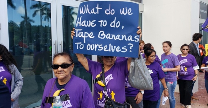 Участники демонстрации наклеили бананы на свои фиолетовые профсоюзные футболки — это отсылка к инсталляции Маурицио Каттелана «Комик», проданной за $120 тысяч на прошлой неделе во время художественной ярмарки «Арт-Базель» в Майами-Бич, сообщает Miami New Times.