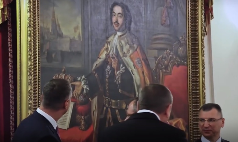 В эфире телеканала «Россия» показали интересный момент. Перед началом заседания белорусские чиновники с интересом разглядывали величественный портрет Петра I.