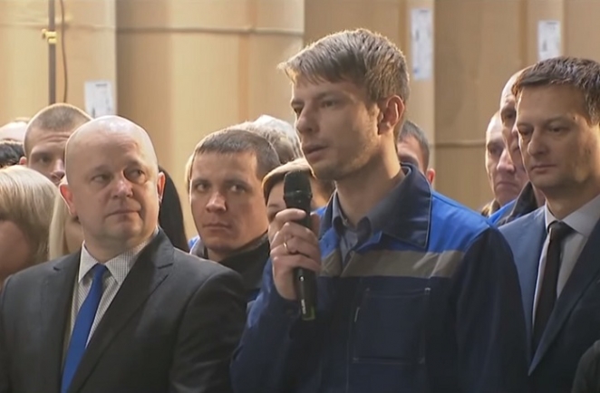 По БТ показали, как работник Завода газетной бумаги, несмотря на сильное волнение и дружащий голос и руки, произнес сверхсложный вопрос.