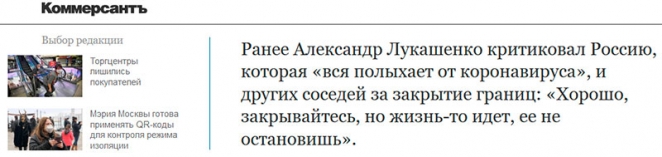 Издание не только опубликовало информацию своих источников о якобы запрошенной Беларусью у России помощи в борьбе с коронавирусом, но и по пунктам раскритиковало поведение официального Минска. По большей части досталось персонально Александру Лукашенко.