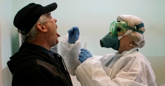 Медсестра в защитном снаряжении берёт у мужчины мазок для анализа на коронавирус в Беларуси / Reuters