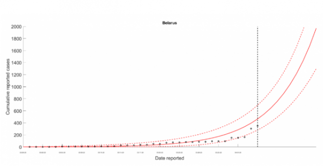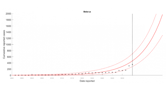 Так, директор по исследованиям в “EAST Center” Андрей Елисеев полагают, что в случае отсутствия всяких мер по противостоянию коронавирусу число смертельных случаев в Беларуси к концу эпидемии может составить 66 тысяч человек. В своём прогнозе по Беларуси профессора Университета штата Джорджия Павел Скумс и Херардо Човелл-Пуэнте считают, что на пике может появляться до 4,5 тысячи новых случаев в день.