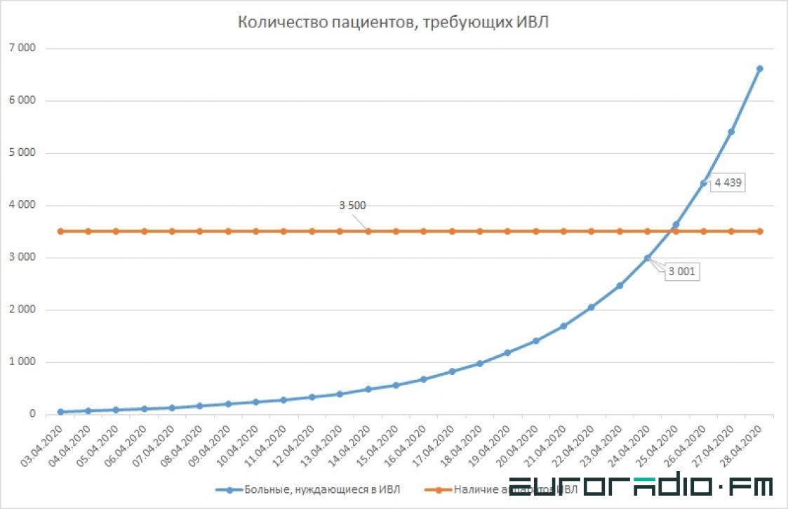 По заявлению министра здравоохранения Владимира Караника, “в стране более 2 тысяч аппаратов искусственной вентиляции лёгких и почти 1,5 тысячи наркозно-дыхательных аппаратов, которые в ряде случаев могут использоваться для искусственной вентиляции лёгких”. Итого максимум 3,5 тысячи аппаратов. По данным учёных, примерно один из 6 заражённых нуждается в аппарате ИВЛ.