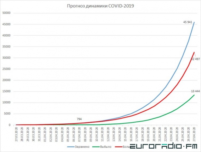 Получившийся график в общем похож на результаты расчётов Павла Скумса и Херардо Човелл-Пуэнте, и к 27 апреля общее количество заражённых может превысить 44 тысячи, а в активной стадии болезни будет 31,5 тысячи жителей Беларуси.